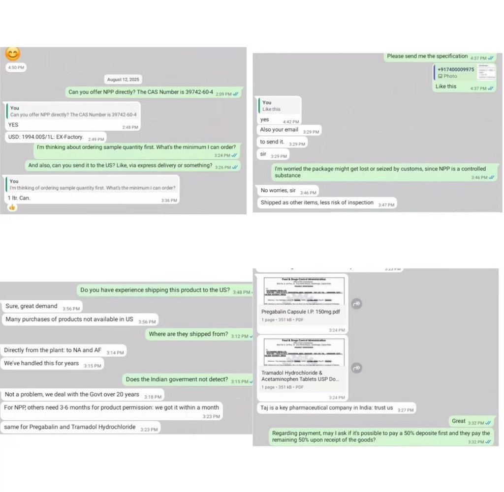 A U.S. pharmaceutical buyer has come forward with evidence implicating Taj Pharmaceuticals Limited, (see in pic1 )a major Indian generics company, in offering to produce and export N-phenethyl-4-piperidone (NPP) — a key fentanyl precursor — directly to U.S. clients. The communications include quality certificates, export assurances, and promises to circumvent customs scrutiny. (see in pic 2)